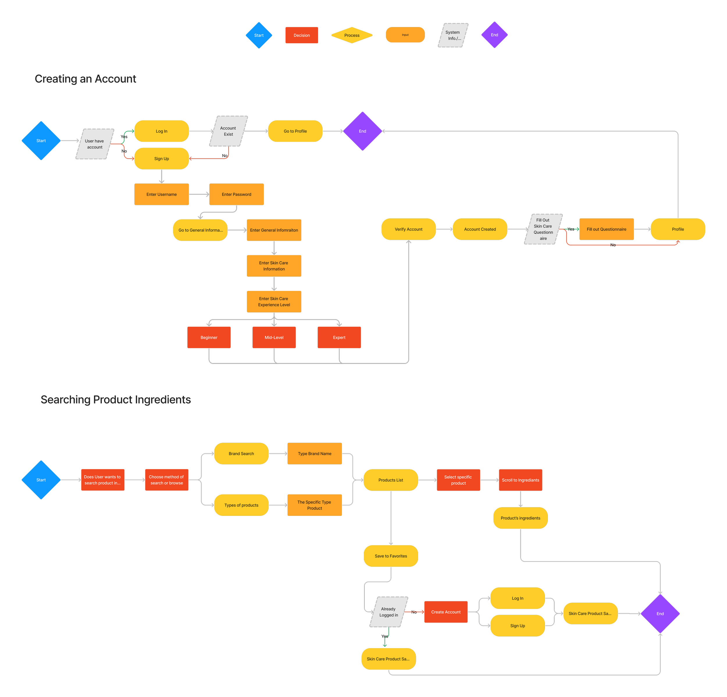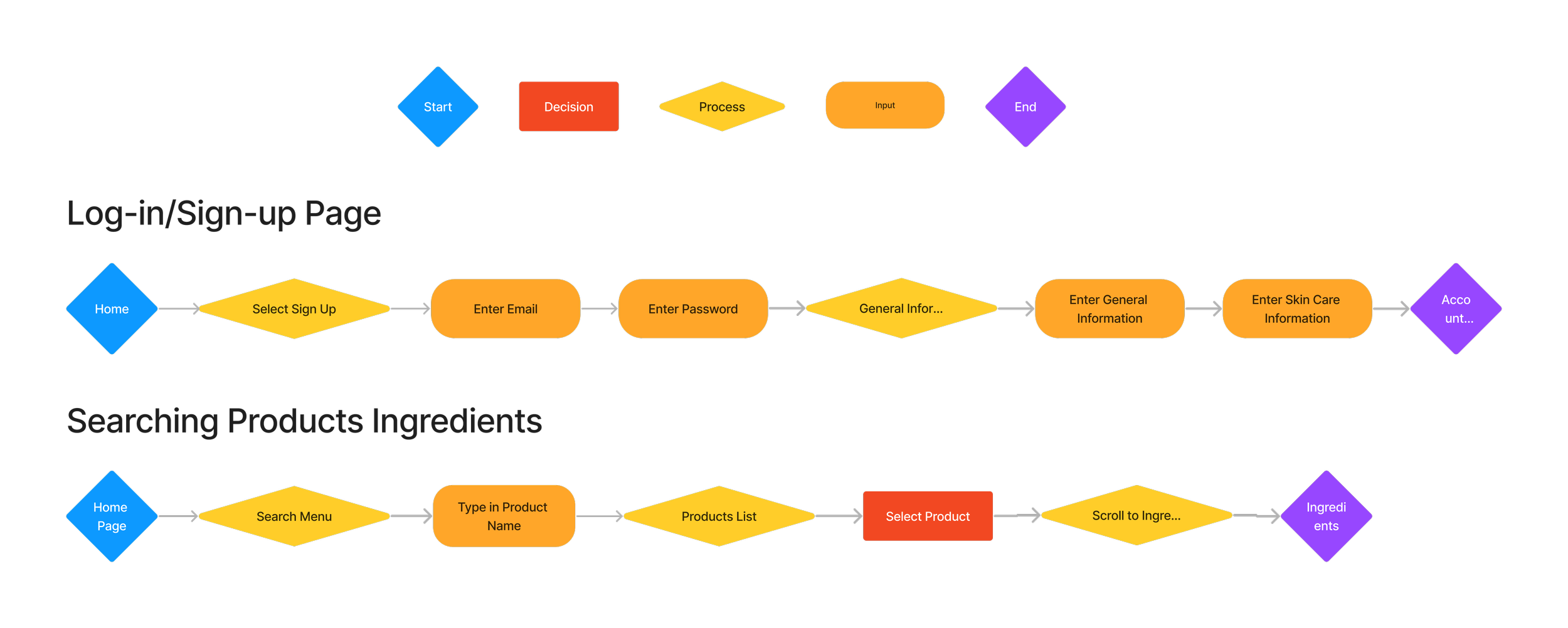 To better illustrate the user decision-making process and overall experience, I created a user flow aligned with the task flows. This helped me critically evaluate specific user interactions and uncover potential pain points or friction within the journey. Below is the user flow for Christine as she creates an account and searches for the product’s ingredients.